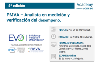 EVO (Efficiency Valuation Organization) y ANESE organizan un nuevo CURSO PRESENCIAL para la Certificación PMVA – Analista en Medición y Verificación del Desempeño, basada en el Protocolo Internacional de Medición y Verificación del Desempeño (IPMVP®), que se desarrollará del 4 al 6 de febrero, en formato presencial, a celebrar en Madrid.