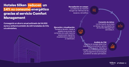 Pero, para entender cómo y cuáles son los beneficios, vamos a analizar un ejemplo concreto. Silken Hoteles ha apostado por la activación del servicio Comfort Management de Endesa X en dos de sus sedes y, gracias a éste, se han reducido de manera considerable sus emisiones de CO2, al tiempo que ahorran en su factura de la luz y crean un ambiente mucho más agradable para sus empleados y clientes.